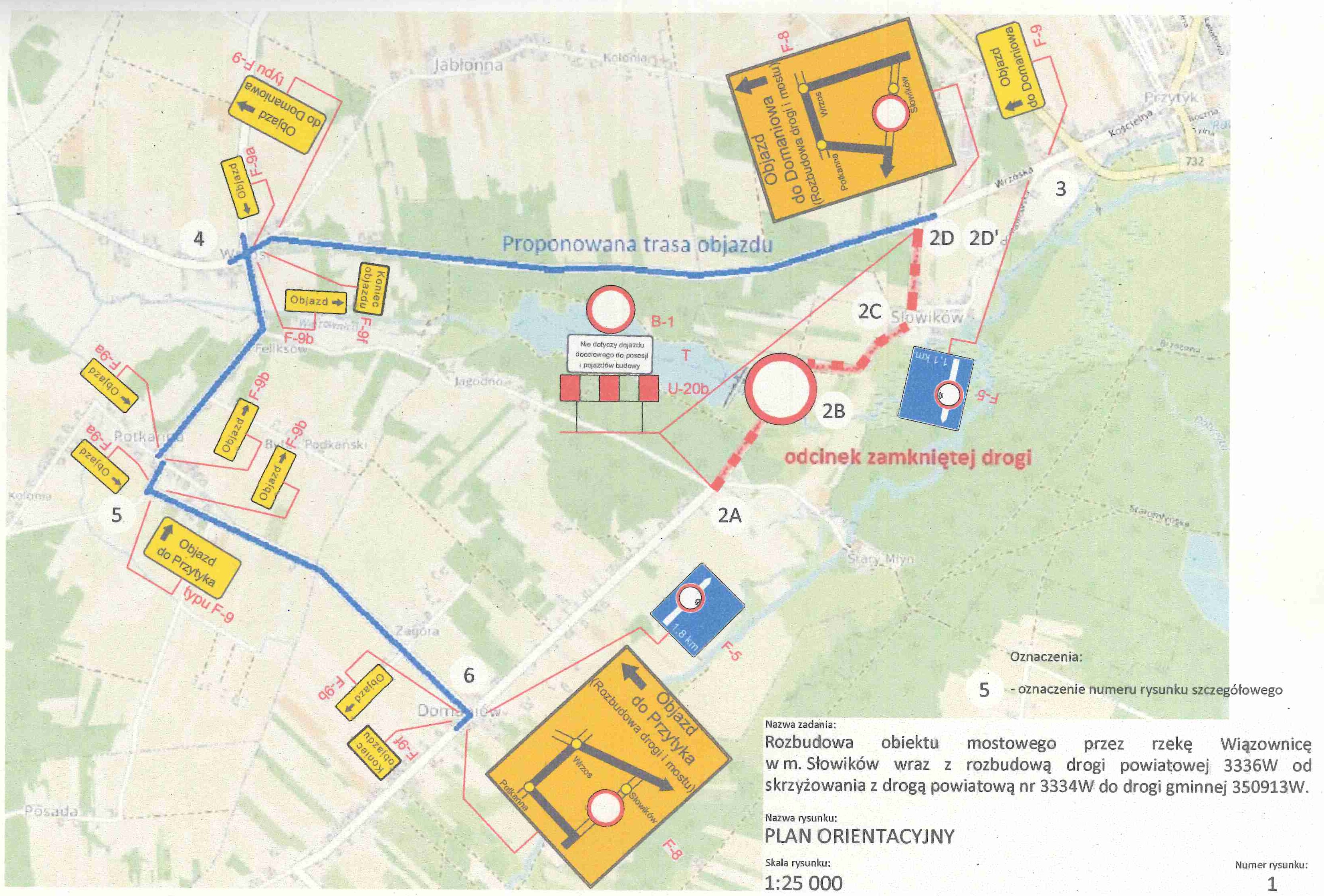 Informujemy, że w związku z realizacją zadania inwestycyjnego pn. "Rozbudowa obiektu mostowego przez rzekę Wiązownicę w m. Słowików wraz z rozbudową drogi powiatowej nr 3336W Wieniawa – Przytyk – Jedlińsk od skrzyżowania z drogą powiatową nr 3334W do drogi gminnej nr 350913W" Wykonawca robót: "BUDROMOST-STARACHOWICE" Sp. z o.o. z siedzibą w Wąchocku, wprowadzi w dniu 27 czerwca 2023 roku na przedmiotowym odcinku drogi czasową organizację ruchu zgodnie z zatwierdzonym projektem.