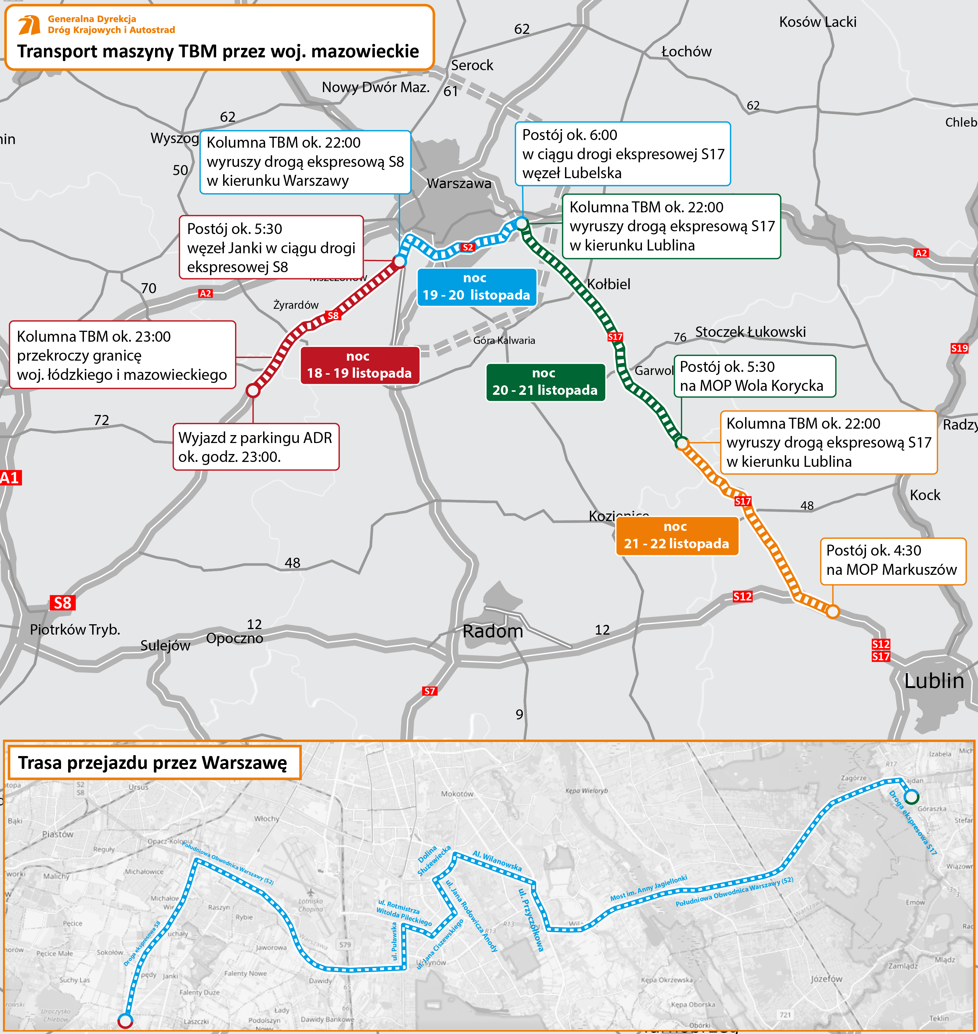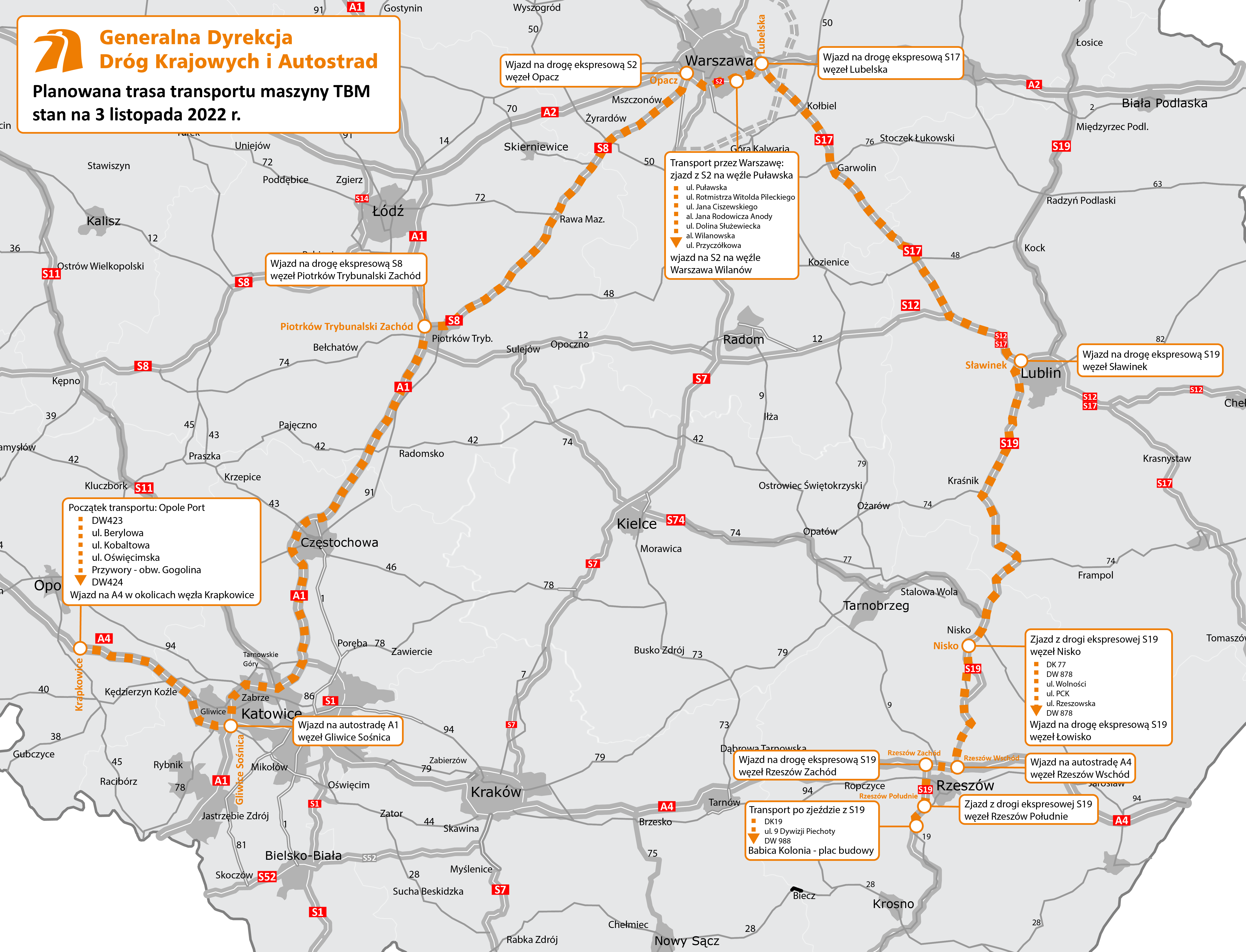 W nocy z 11 na 12 listopada wyruszył transport maszyny TBM, która wydrąży tunel na odcinku drogi ekspresowej S19 Rzeszów Południe - Babica (woj. podkarpackie). To wyjątkowe przedsięwzięcie pod względem logistycznym i technicznym przygotowywane od wielu miesięcy przez wyspecjalizowane firmy.