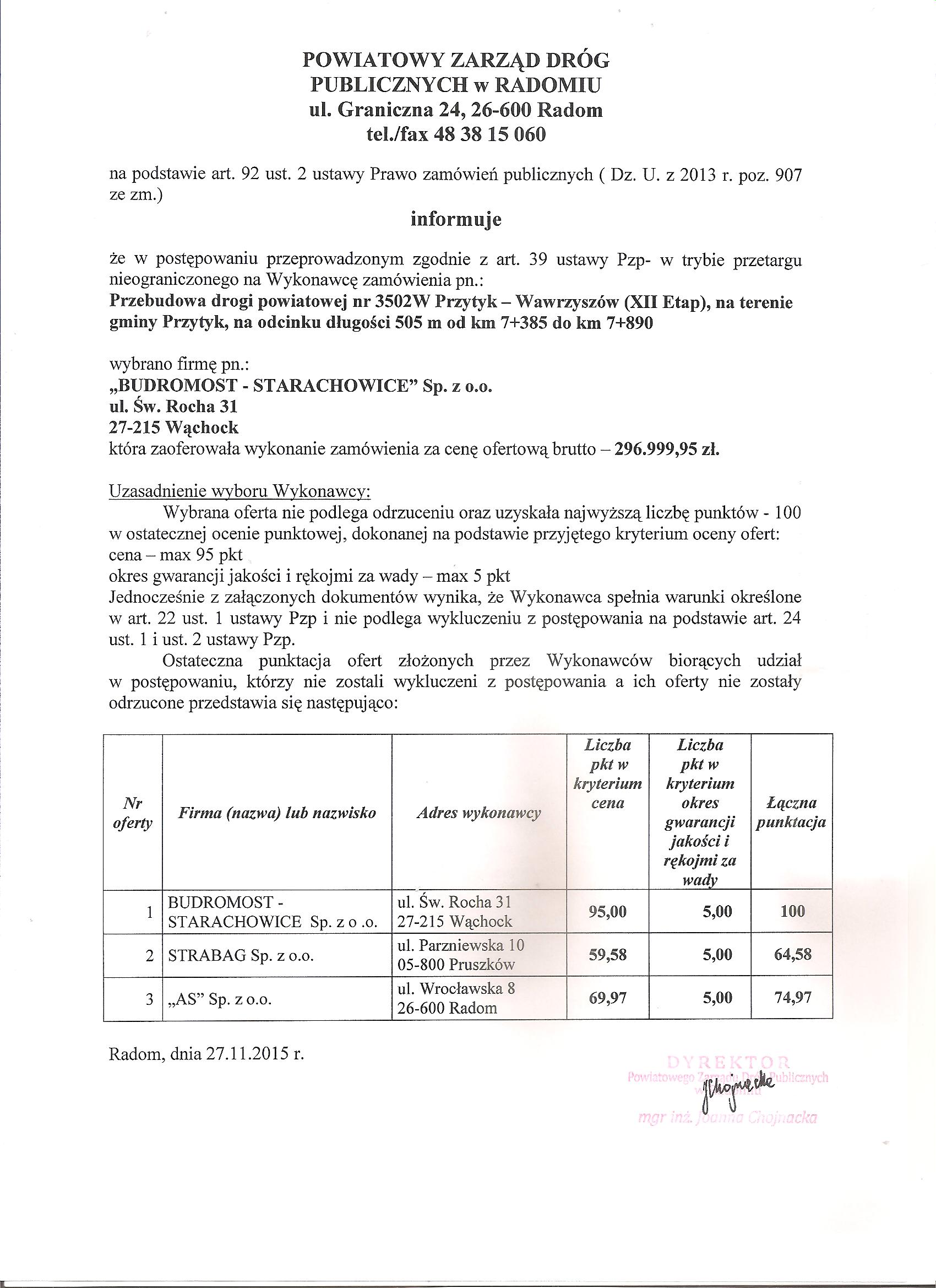 Przebudowa drogi powiatowej nr 3502W Przytyk - Wawrzyszów (XII Etap)
